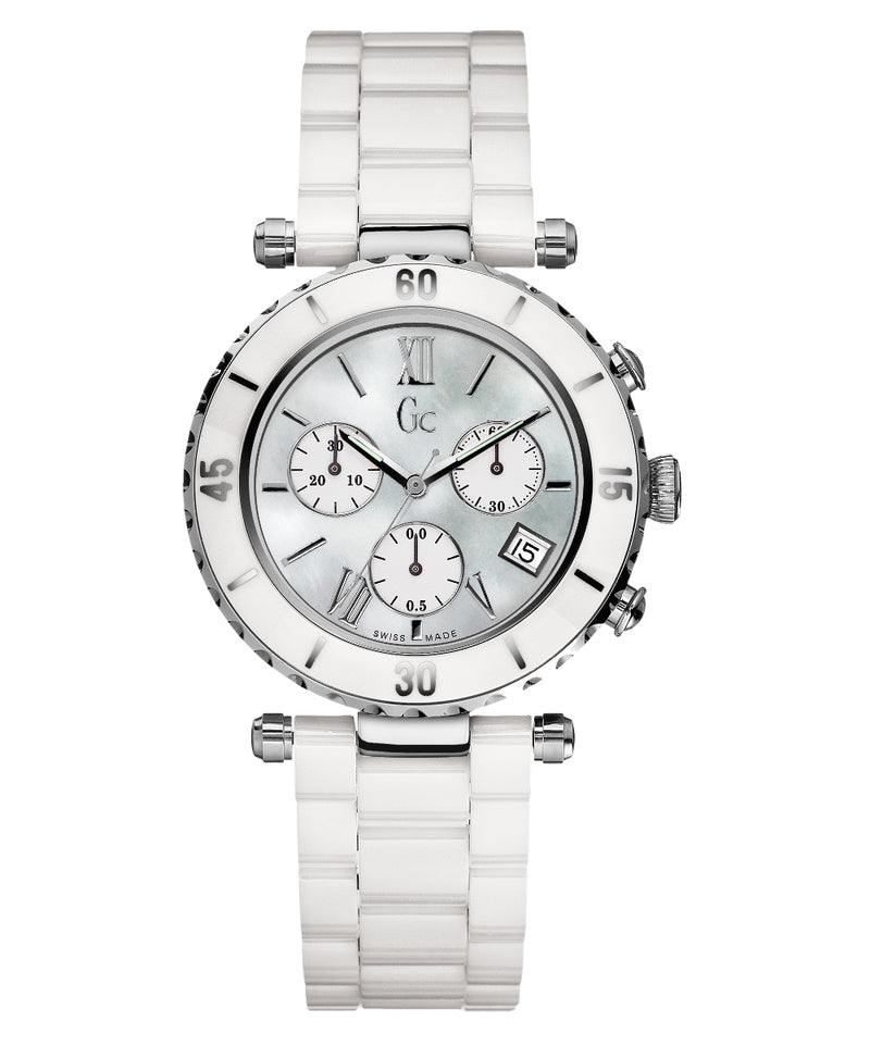 A highly sophisticated sporty chic timepiece with ceramic bezel and bracelet, highlighted by a silver tone case and dial accents